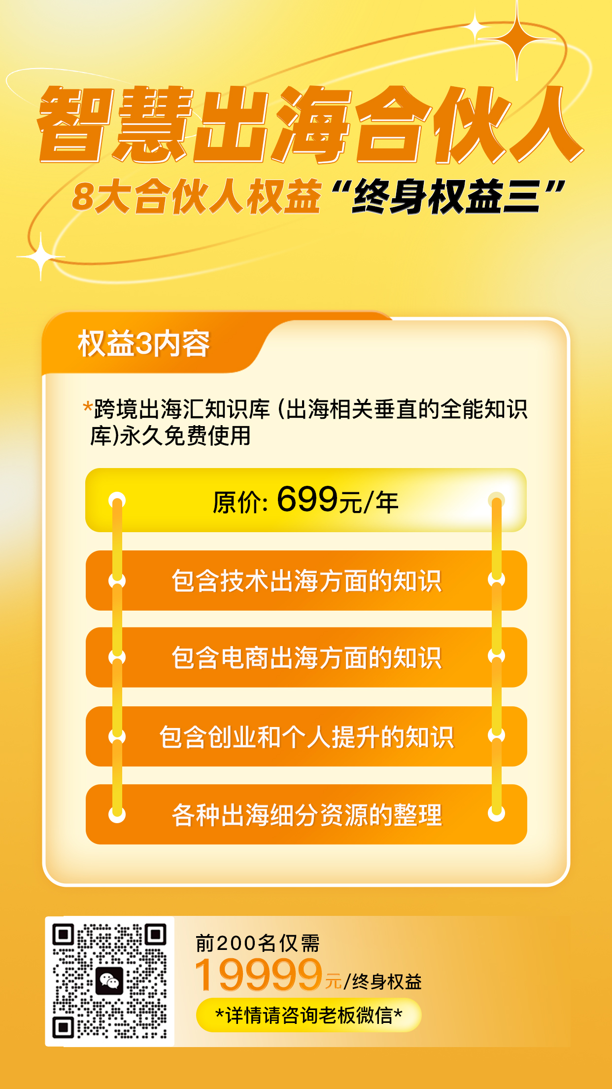 合伙人的圈子环境会让我们的关于跨境出海的信息、资源更加的同步与即时,也会更丰富,或许能探讨出不一样的火花。(其他的合伙人我不敢保证绝对也会输出,但是我个人会持续关注(目前已付费十几个跨境出海社群)在跨境出海领域的讯息与资源,并进行在群内分享,希望能够给到一点启发),算是组建一个跨境出海领域的强大智囊团,在跨境出海领域真的做到垂直1厘米,深耕10公里。跨境出海的相关问题有问必答(实在答不上也找不到资源渠道解决的除外)。