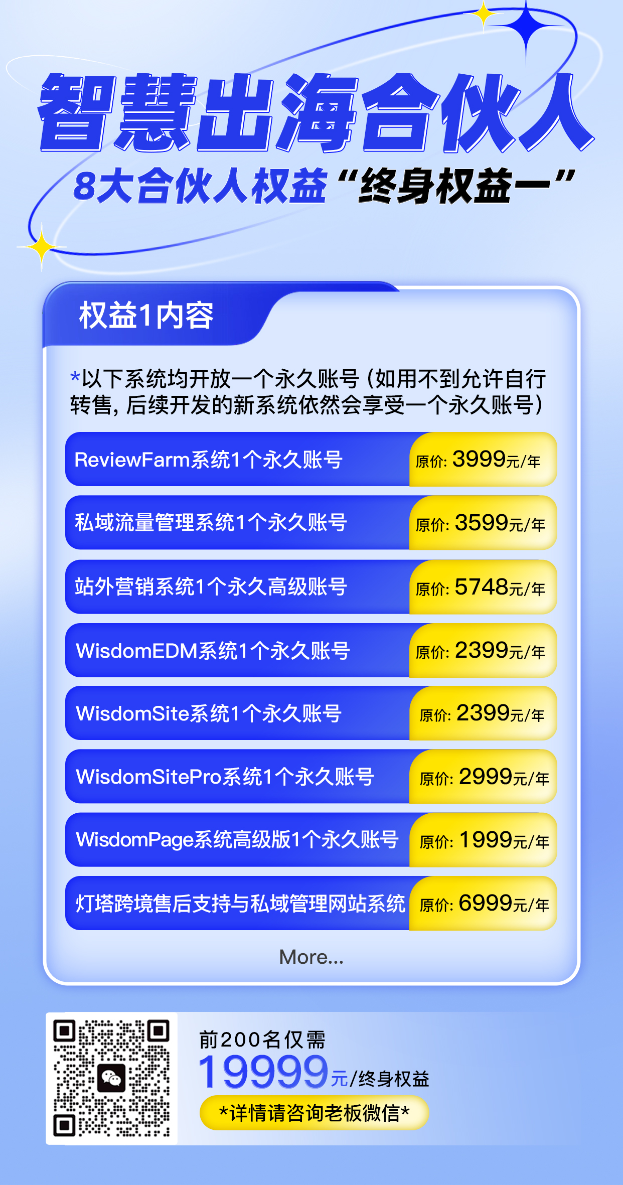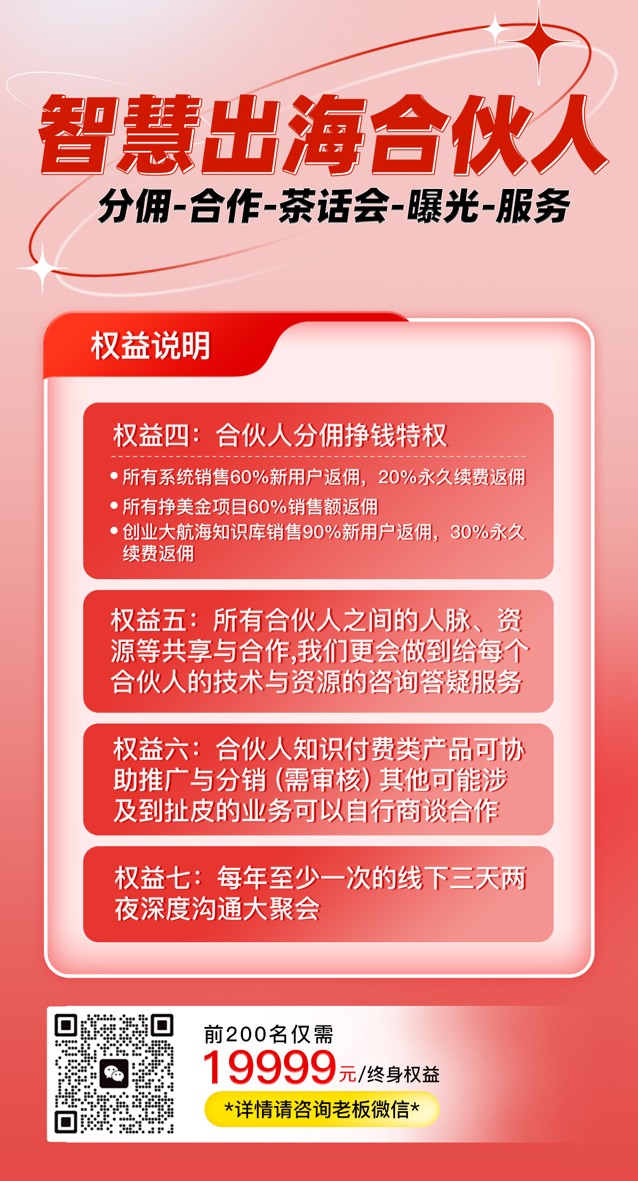 前200名智慧出海合伙人均为1次性收费(1次性付费只是为了感谢早期兄弟姐妹们的支持),19999元(对公转账开票,其实我觉得价格低了,先不要喷,情况不一样,后面有说明),后续的加入人员为年费制且可能上调。另外前50名加入的合伙人,为了感谢信任与支持,会额外赠送一份小惊喜(几种额外福利可根据需要选择一种)。