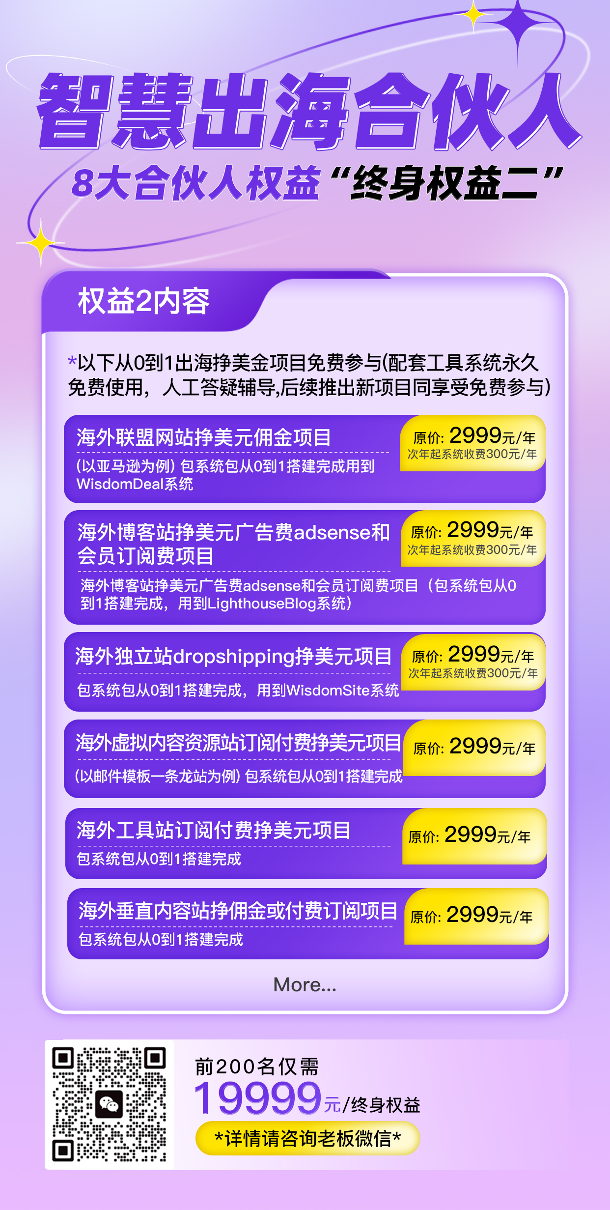 当然如果你成为智慧出海合伙人的话,所有的这些项目和系统你都可以免费使用。但这个项目单独售卖是怎么样的呢,只要2999元,买1年送1年,第3年起继续使用仅需500元/年成本费。我们现在已经整理了大概七八个相关挣美元的项目和配套系统,后续还会不断增加与优化,如果你其中一个项目和系统操作过一段时间觉得不合适,没关系,关掉后,可以开启另外一个项目和系统的尝试,不用额外花钱,只是你花一分钱不能同时做几份项目而已(智慧出海合伙人可以)。最后注意,如果搭建过程中涉及到第三方的服务收费,需要自费的,比如需要买网站域名、需要注册海外公司、需要注册海外商标等等,我们都会协助,也不会从中额外挣钱,你们直接付给第三方平台就行。